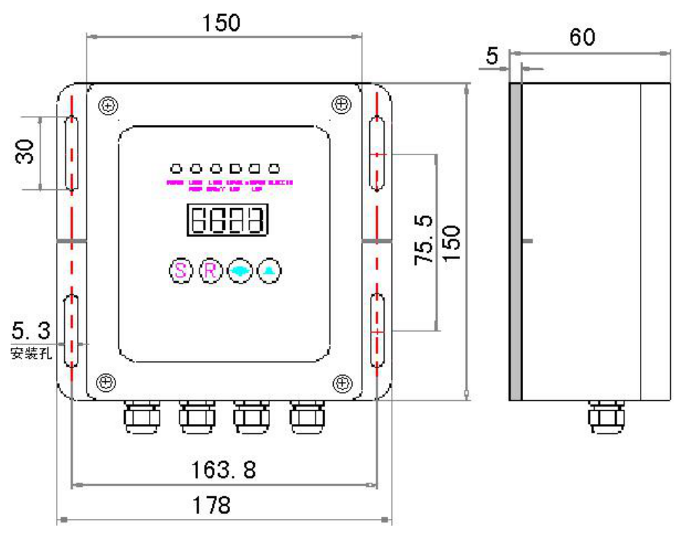 面板顯示窗口有四位數碼管,用于顯示系統工作狀態和編程。六個指示燈分別為:電源;油路