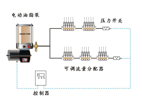 該系統的特點是每個潤滑點同時供油,且流量可調,適合高要求高可靠性